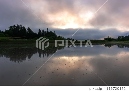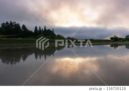 水面に映る農家のシルエットと幻想的な田植え.