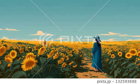 真夏の青空のもと、ヒマワリ畑を散策している若い女性