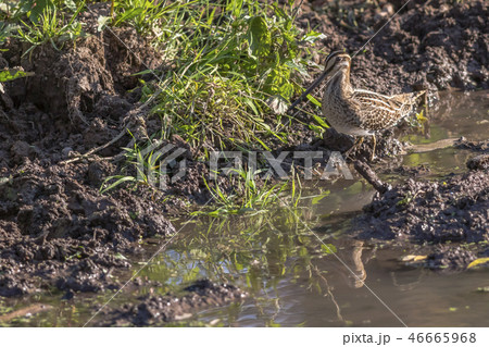 生き物 野鳥 タシギ、体長は二十七センチほど。長い嘴を泥に突き刺してミミズや昆虫を食べます