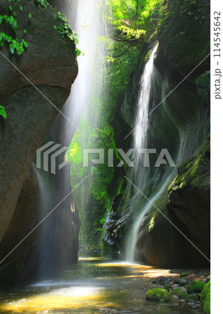 由布川渓谷の幻想的な峡谷と岩肌を流れる滝