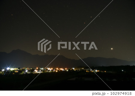 北杜市白州町、南アルプスの山並みに輝く宵の明星と麓の街灯り