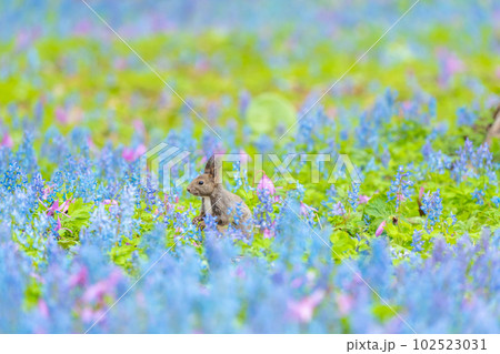 【北海道】カタクリとエゾエンゴサクの花畑に現れたエゾリス