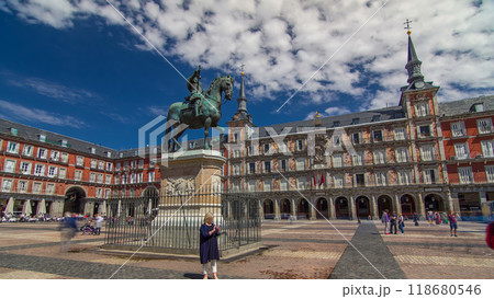 Statue of Philip III timelapse hyperlapse at Mayor plaza in Madrid in a beautiful summer day, Spain