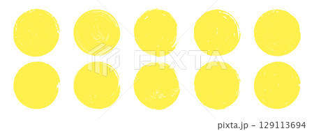Yellow brush sun circles set. Grunge round stamp collection. Hand drawn crayon abstract elements.