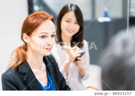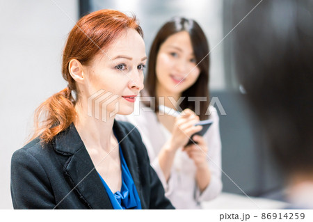 会議で発言する外国人女性と通訳の女性
