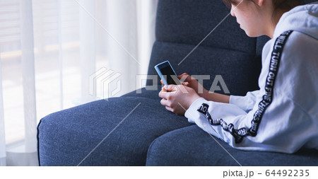 スマホ SNS 見る 中毒 留守番 コミュニケーション 女性 中学生 高校生 日本人 ソファー 休校