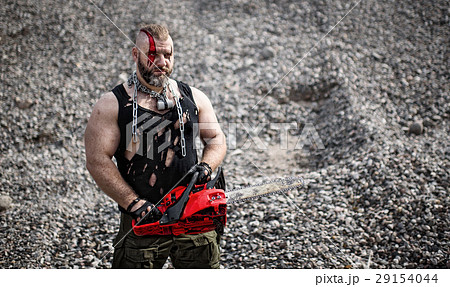 man with a red chainsaw is attacking