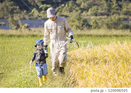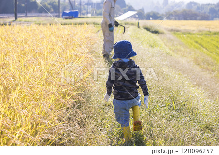 お父さんと手を繋いで田んぼの畦道を歩く男の子