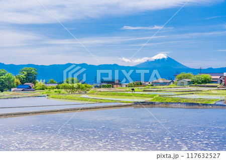 【山梨県】田植えの準備の整った田んぼ越しに富士山