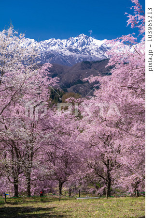 《長野県》満開の桜と北アルプスの山々・番所の桜
