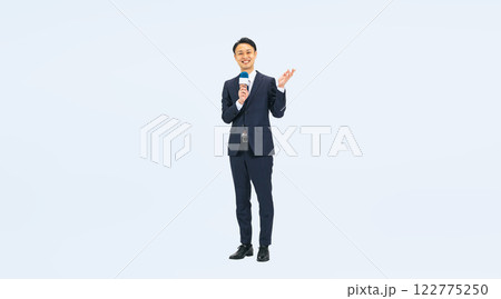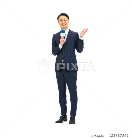 マイクを持ってレポートするミドル男性ビジネスパーソンの全身写真