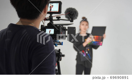 撮影スタジオで動画を撮る動画カメラマンと被写体