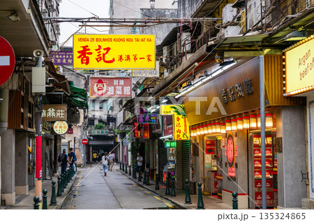 マカオの歴史的な街並み 賑やかな看板が並ぶ官也街の路地