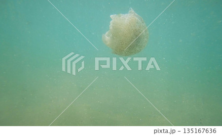 Jellyfish swimming in green water with particles floating around