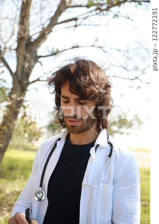 Long Hair Man Doctor Talks With Patient In Park Outside Private Clinic