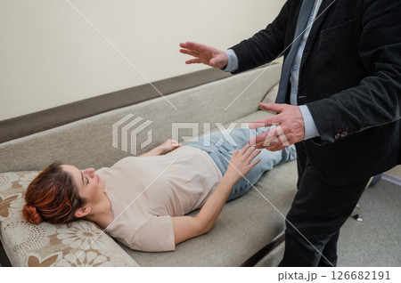 Elderly male hypnotherapist with a female patient. An alternative way to heal mental health