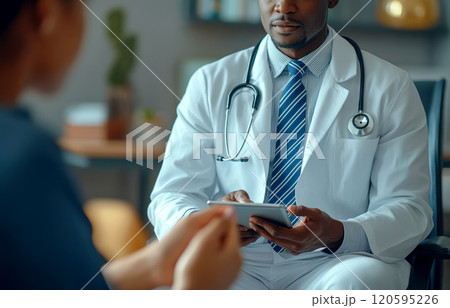 African american doctor presenting the x ray diagnostics on tablet, explaining the test results and analysis for wellness. Medical staff supporting a woman patient through recovery.