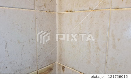 Accumulated dirt on the walls and floor in the bathroom.