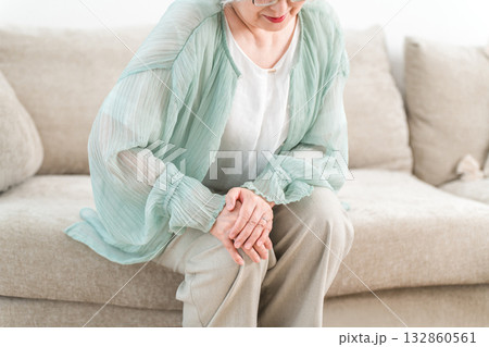 ソファーに座り膝を痛がるグレイヘアーのシニア女性(膝,膝痛)