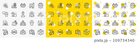 Teamwork, People and Technical documentation. Engineering line icons. Blueprint with gear, engineer and construction helmet set icons. Technician, industrial people, engineering process. Vector
