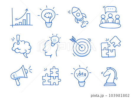 Business idea, startup doodle line icon set. Hand drawn doodle sketch line style business strategy, finance goal concept. Rocket, target, brain cute element. Vector