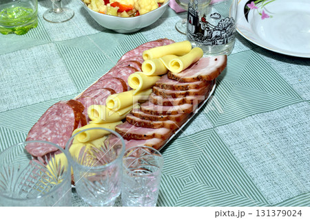 Sliced ham, meat or pork sausage for sandwiches. Cooked smoked prosciutto, ham