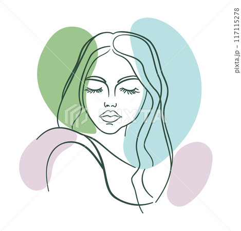 Beautiful Girl in Thin Thick Line Art For Beauty Cosmetic Healthcare with Green Blue Watercolor