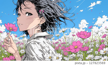 コスモス畑でデートをしている若いカップルコスモス畑でデートをしている若いカップル