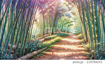秋の森に光が差し込み黄金色に輝く紅葉と小道が広がる幻想的で美しいファンタジー風景イラスト