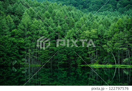 Tranquil Forest Lake with Misty Fog and Lush Green Reflections in Serene Natural Landscape