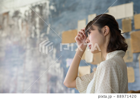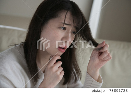 枝毛・ダメージヘアに悩む女性、髪の毛を見て悩む女性イメージ