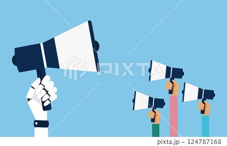 青い背景に手で持たれたメガホン