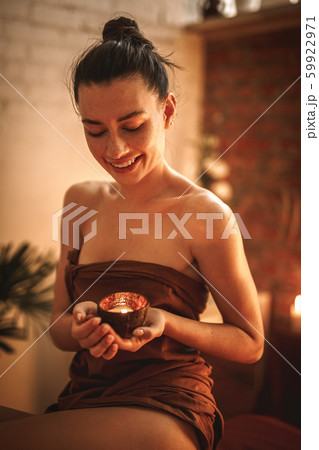Alternative Medicine. Woman sitting in towel holding aroma candle laughing cheerful close-up