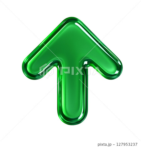 光沢感のある緑の上向き矢印アイコン、立体的なガラス風の上矢印、明るいグリーンの上向き記号