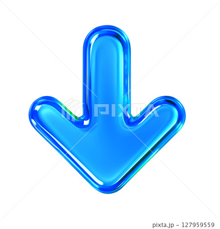 光沢感のある青の下向き矢印アイコン、立体的にデザインされた青い下矢印、ガラス風の青い下向き記号