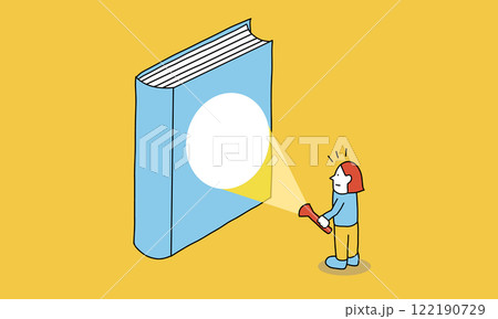 資料を探す人物のイメージイラスト 本の表紙を懐中電灯で照らす女性