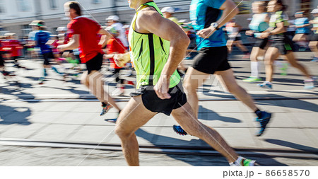 group athletes runners running marathon motion blur