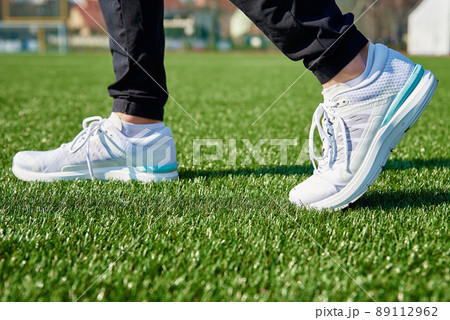 Male runner feet with white sneakers at stadium with green grass, close up. Sport sneakers for jogging. Fitness and healthy lifestyle concept