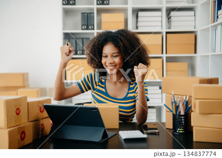 Small business entrepreneur SME freelance woman working at home office, BOX,tablet and laptop online, marketing, packaging, delivery, e-commerce concept