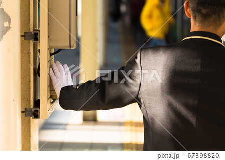 ホームの発車ベルを押す車掌