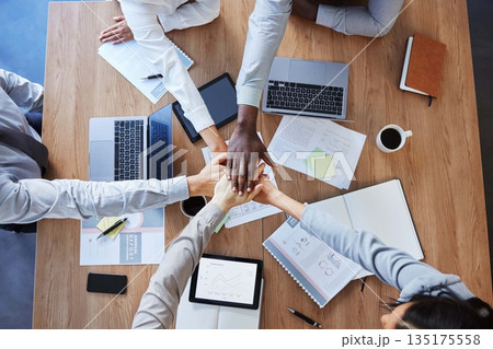 Hands in stack, teamwork or top view of business people in collaboration for mission goals in company. Partnership, diversity or employees in meeting with strategy, motivation or support in office