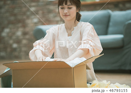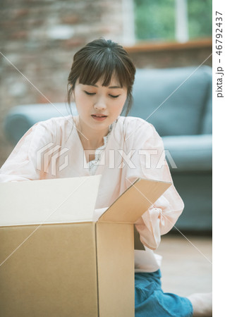 ネットショッピング 女性 洋服 ダンボール カメラ目線