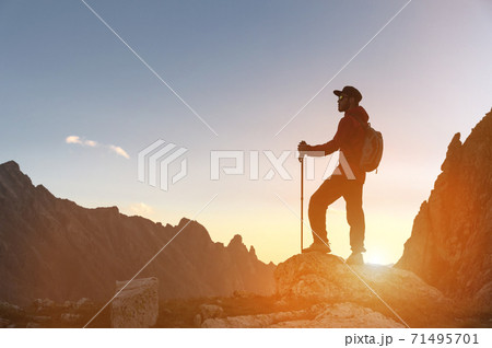 Silhouette of a man traveler in a cap with a backpack and trekking poles. Stands on the edge of a cliff against the background of mountains and the skyline in the evening at dusk