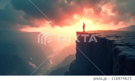 Lone explorer on mountain cliff during golden hour, vast wilderness view, serene sunset over rugged peaks, inspirational solo journey backdrop, dramatic outdoor adventure setting in wilderness
