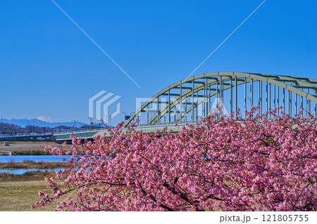 河津桜が咲く東京都狛江市の多摩川河川敷から多摩水道橋と川崎市多摩区、富士山方面を見る
