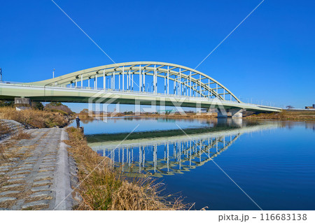 川崎市多摩区の稲田多摩川公園付近から多摩川に水面反射する多摩水道橋を見る