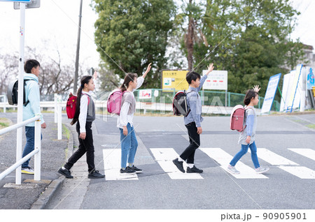 ランドセルを背負って横断歩道を渡る三人の小学生 登下校