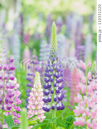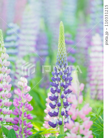 花と富士・ルピナスの花(青系)近景に初夏の富士・花一列横位置