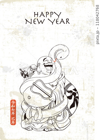 2025年賀状テンプレート「へびと布袋尊」ハッピーニューイヤー 手書き用スペース付