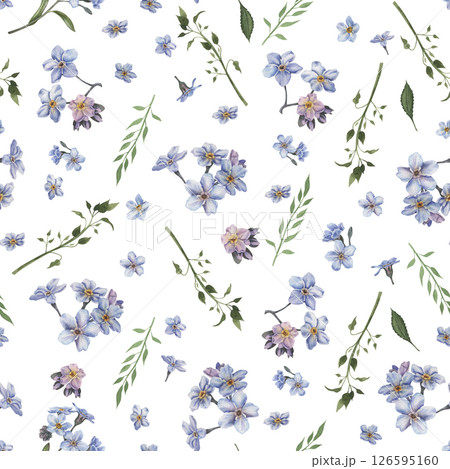 Watercolor floral seamless pattern with little blue flowers. Wedding background with Myosotis, Hyacinthus, Borago, Linum. Summer ornament Botanical design a for wrapper, wallpapers, romantic invites.